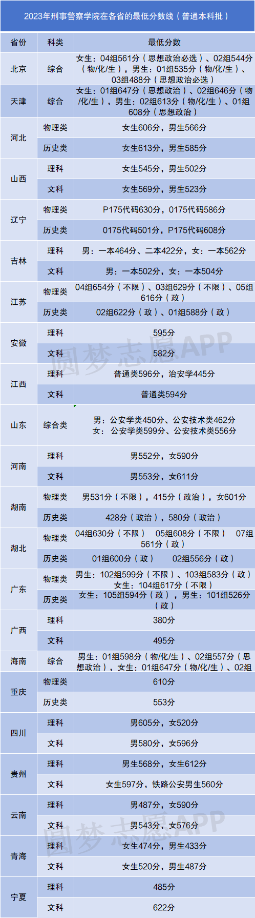 小编根据圆梦志愿提供的数据,整理了刑事警察学院2023年在各省的分数。