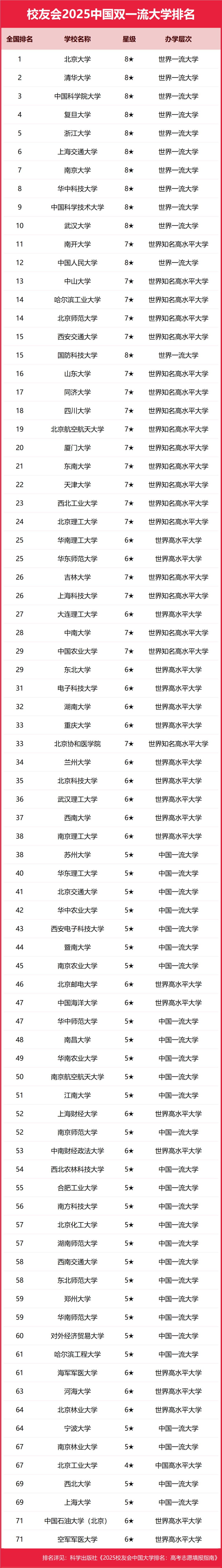 下面是2025年全国双一流大学最新排名一览表: