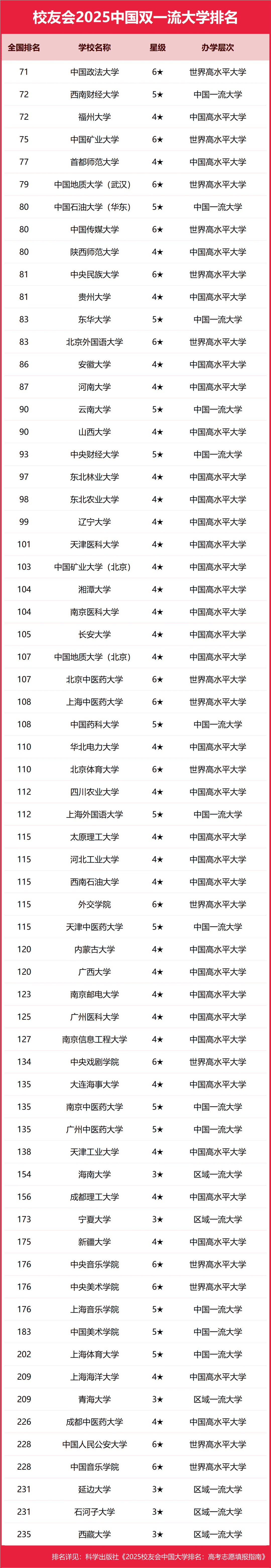 以校友会2025年排名数据为例,双一流大学最新排名均在全国前240名以内,排名最靠后的是西藏大学,2025年最新排名为235名,其次是石河子大学,2025年最新排名为231名。