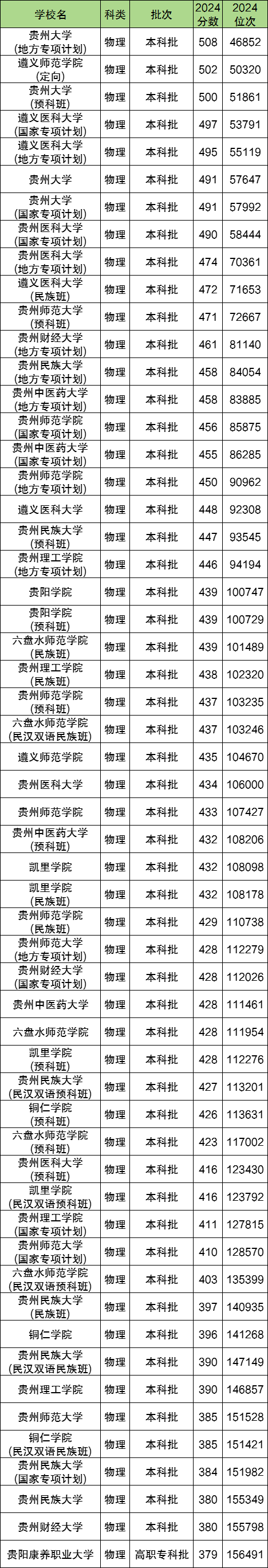 2024年在贵州省物理类科目录取中,收分最高的大学为贵州大学(地方专项计划),2024年最低分为508分,最低位次为46852名;其次是遵义师范学院(定向),2024年最低分为502分,最低位次为50320名。