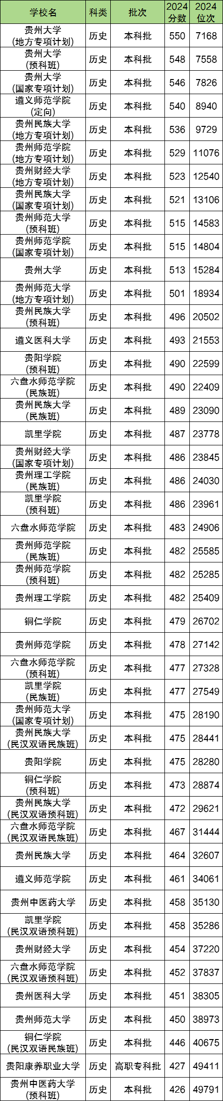 2024年在贵州省历史类科目录取中,收分最高的大学为贵州大学(地方专项计划),2024年最低分为550分,最低位次为7168名;其次是遵义师范学院(定向),2024年最低分为540分,最低位次为8940名。