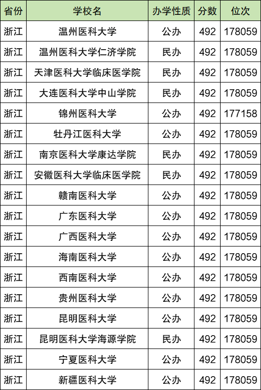2024年浙江高考二本医科大学最低分492分,对应分数线最低的学校有温州医科大学、温州医科大学仁济学院、天津医科大学临床医学院、大连医科大学中山学院等。