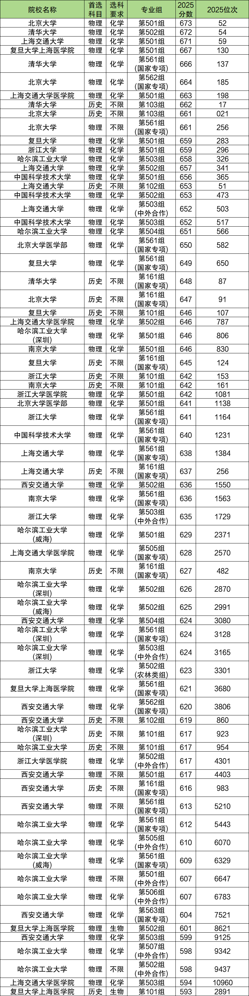 分数线排名靠前的还有:清华大学第561组(物理+化学)(国家专项)(666分)、北京大学第562组(物理+化学)(国家专项)(664分)、上海交通大学医学院第501组(物理+化学)(663分)等。
