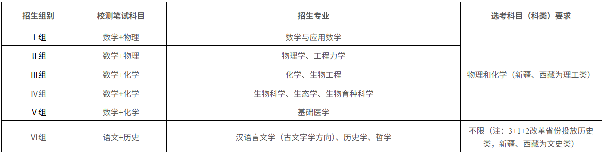 高考后出分前,已完成考试确认的第一类考生参加我校组织的初试,初试形式为笔试。笔试科目:Ⅰ组和Ⅱ组为数学和物理,Ⅲ组、Ⅳ组和Ⅴ组为数学和化学,Ⅵ组为语文和历史。