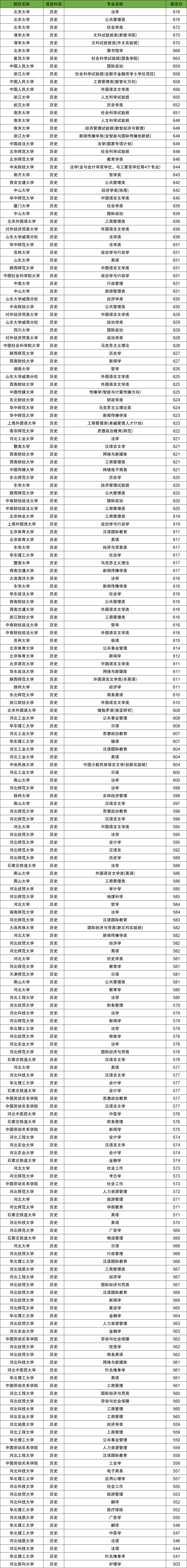 而对于获得国家专项报考资格的历史类考生而言,报考门槛最高的院校及专业是北京大学(法学),投档分数为678分;北京大学(公共管理类)以最低676分的投档分数紧随其后。