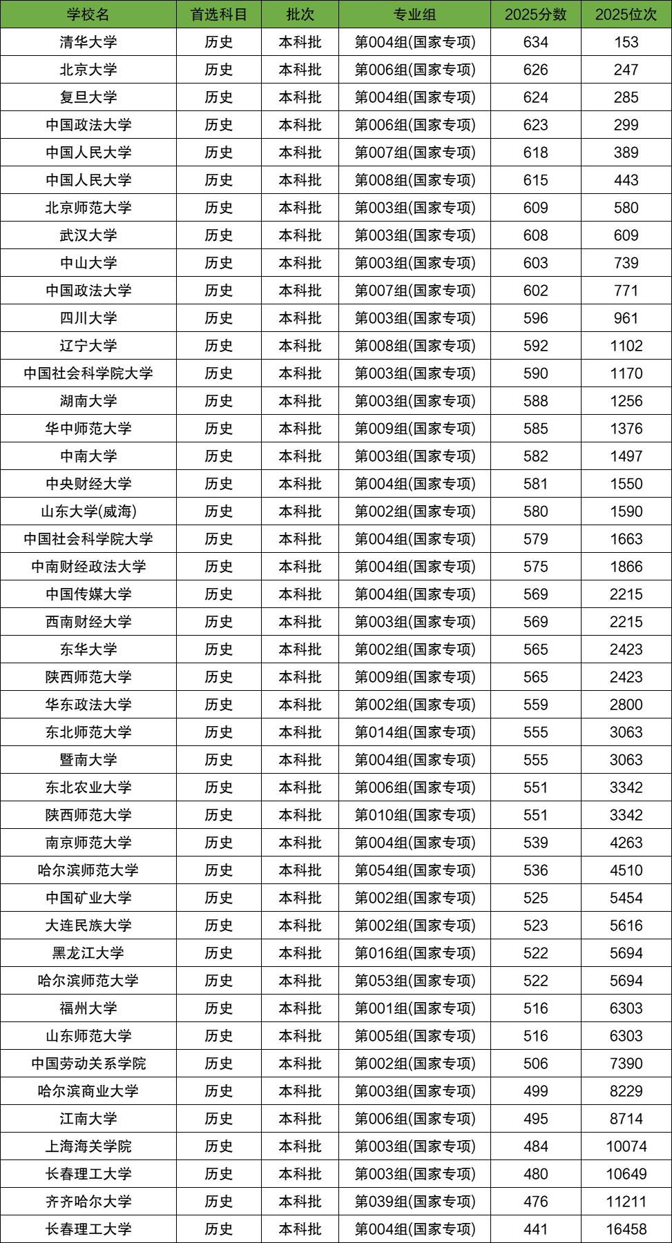 而对于通过了国家专项资格审核的历史类考生而言,今年最低仅需634分就可报考清华大学,624分就可以被复旦大学录取。此外其他985重点院校的在国家专项中的招录分数相对普通类招生批较低:山东大学(威海)580分、四川大学596分、湖南大学588分。