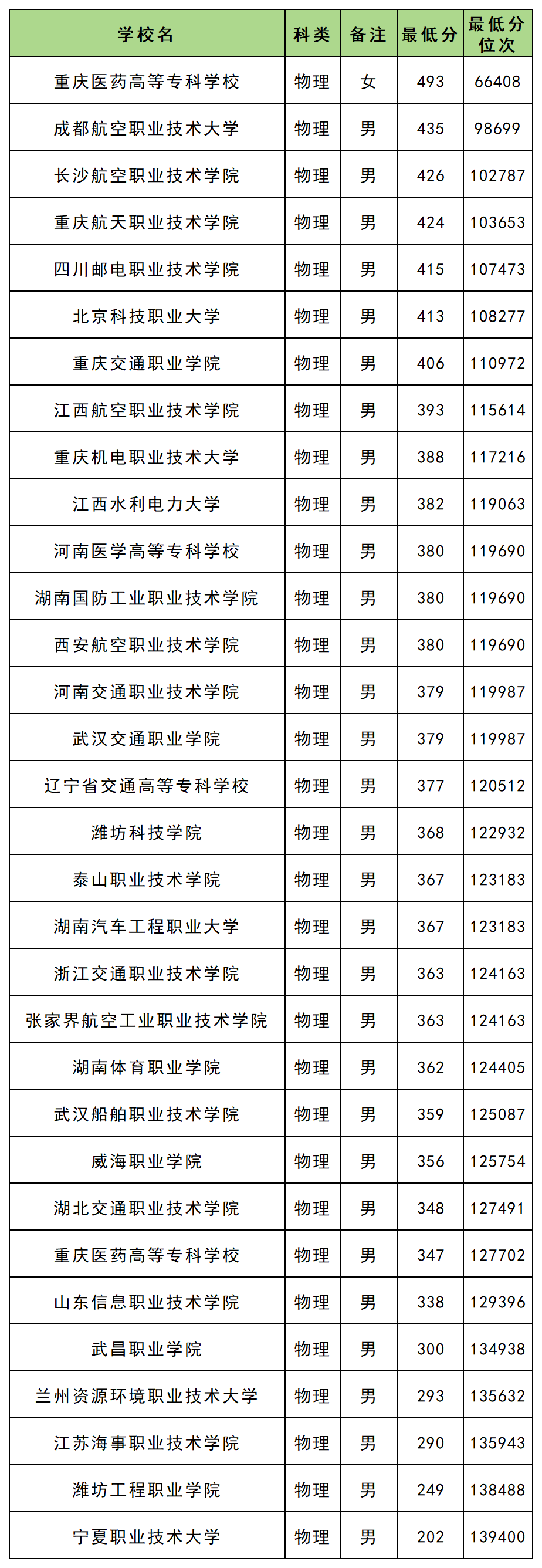 2025年在重庆物理类招录分数线最低的定向士官学校是宁夏职业技术大学,该校男生最低分数线为202分。