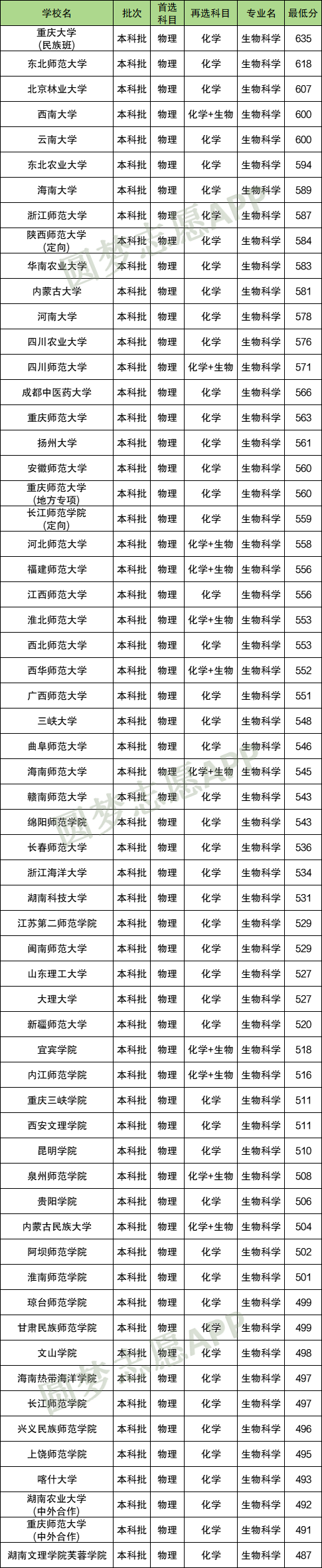 2024年重庆大学(民族班)生物科学专业,要求选科为物理+化学,最低分为635分;
