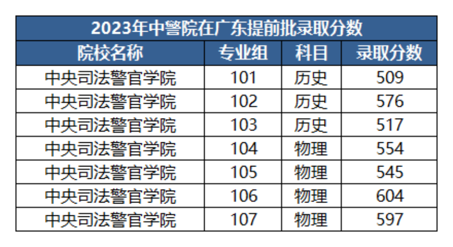 2023年中央司法警官学院在广东首选历史科目组录取分数最低为509分;在物理类录取分数最低为545分。