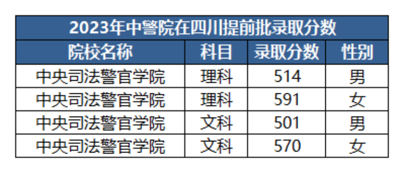 中央司法警官学院在四川理科录取分数为男生514分、女生591分;文科最低投档分数为男生501分、女生570分。