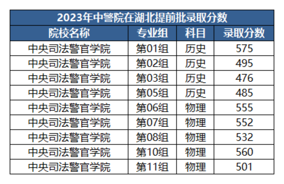 而在湖北首选物理科目组中,中央司法警官学院招生分数最低的专业组是11组,投档分数为501分。