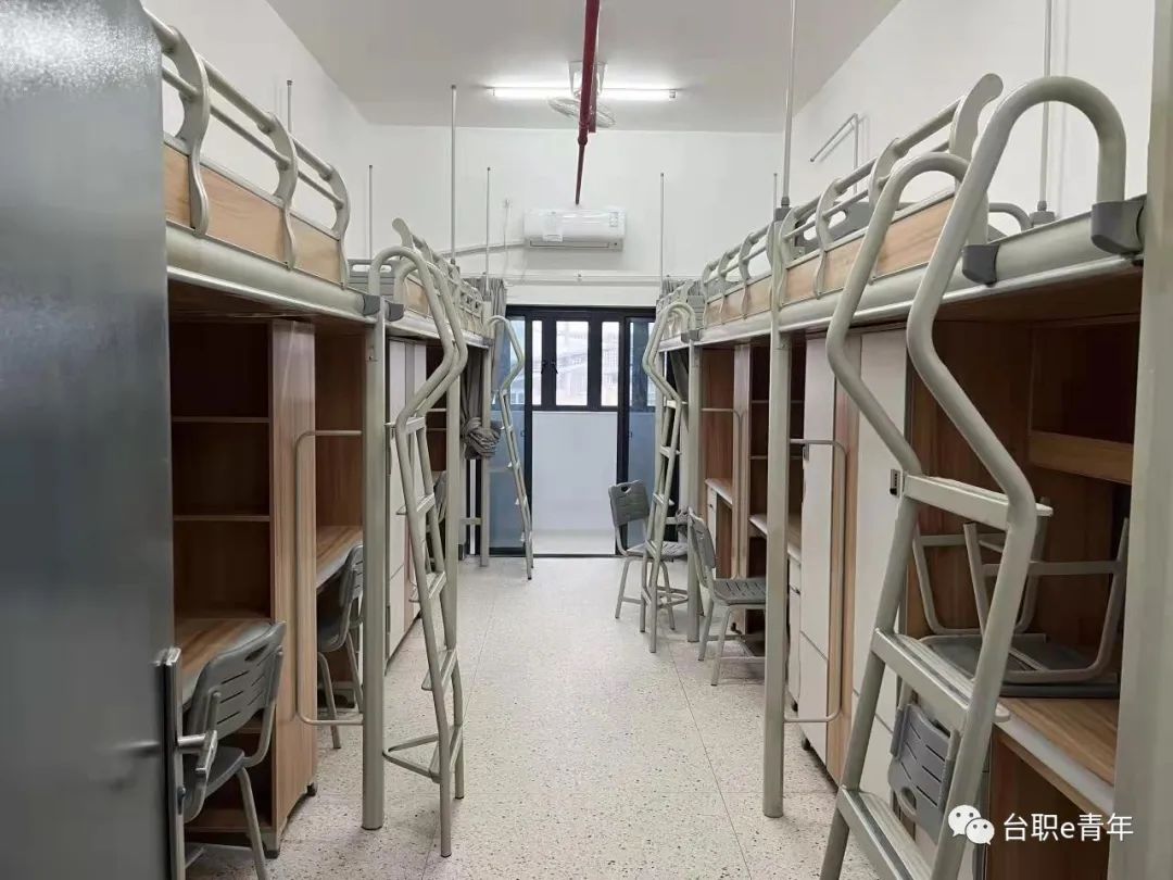 台职院一共有11栋寝室楼,宿舍内部为六人寝室、上床下桌、配有空调,一个桌拥有两个插座,书桌和收纳柜在一起,每间寝室还有大阳台阳台处有洗手台和洗衣台。新宿舍内设有两个电梯,分为单双层,楼道间明亮宽敞。