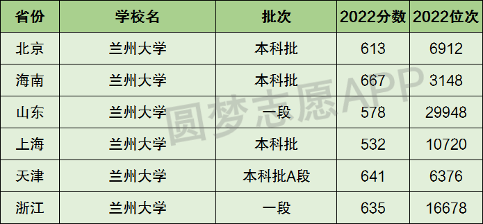 下面圆梦志愿将为大家展示兰州大学2022年在全国各省市的最低分数线和位次,大家可以在了解兰州大学在全国各省详细招生批次的同时,也顺便看看兰州大学的招生录取分数线是多少!