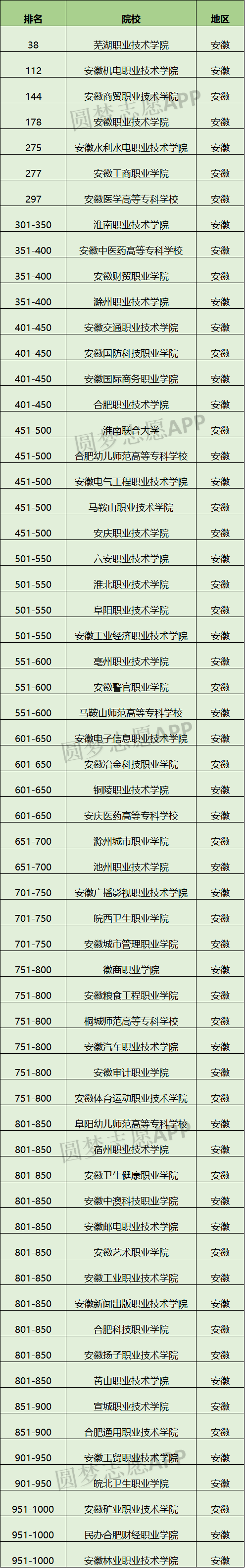芜湖职业技术学院全国排名第38,安徽省内排名第1