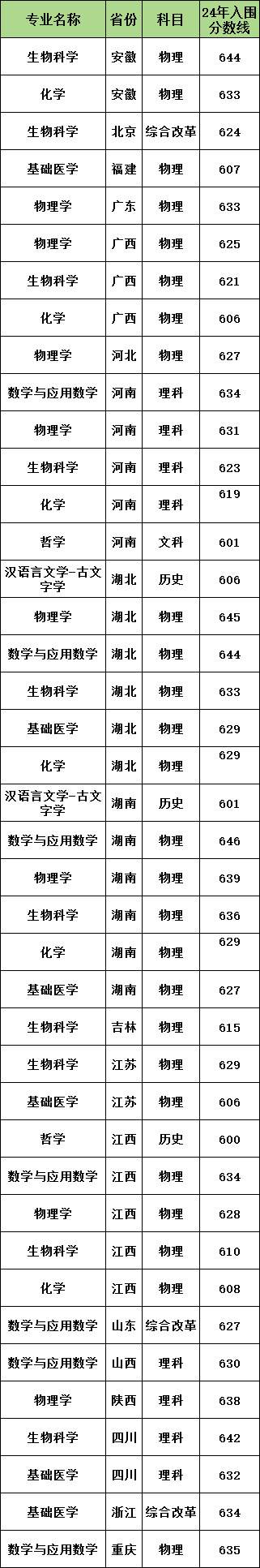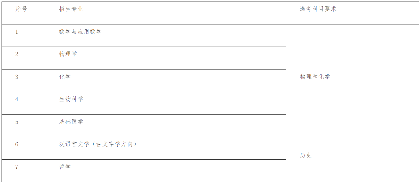 数学与应用数学、物理学、化学、生物科学、基础医学、汉语言文学(古文字学方向)、哲学