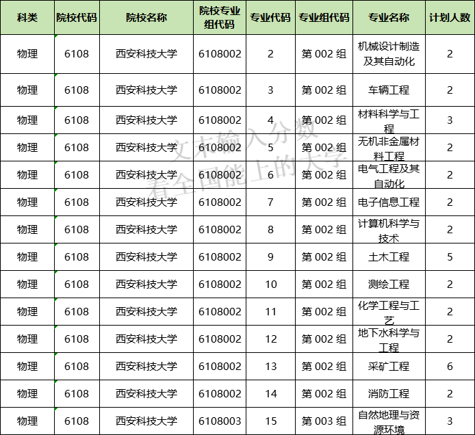 第002组:专业组代码为6108002,包含机械设计制造及其自动化、车辆工程、材料科学与工程、无机非金属材料工程、电气工程及其自动化、电子信息工程、计算机科学与技术、土木工程、测绘工程、化学工程与工艺、地下水科学与工程、采矿工程、消防工程、自然地理与资源环境。