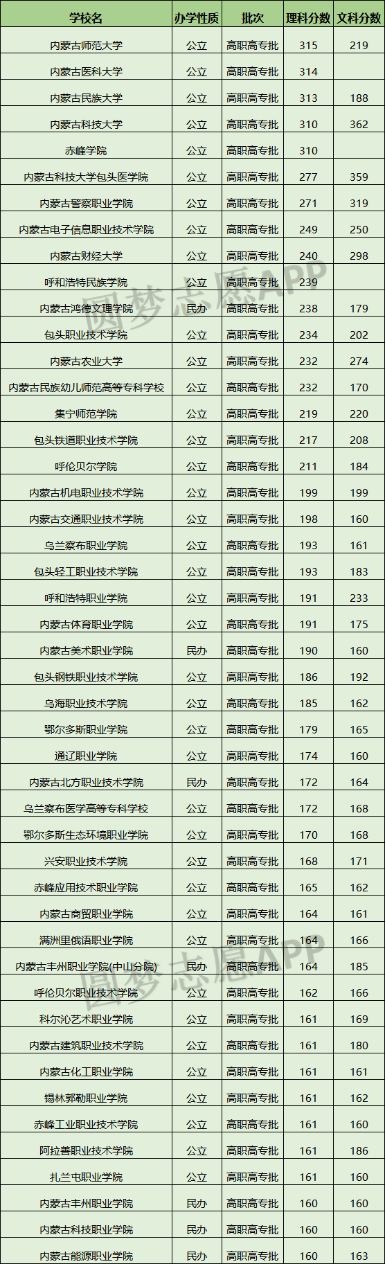 从下表的2022年高考内蒙古所有专科批学校分数线可知,内蒙古共有47所大学在专科批招生。