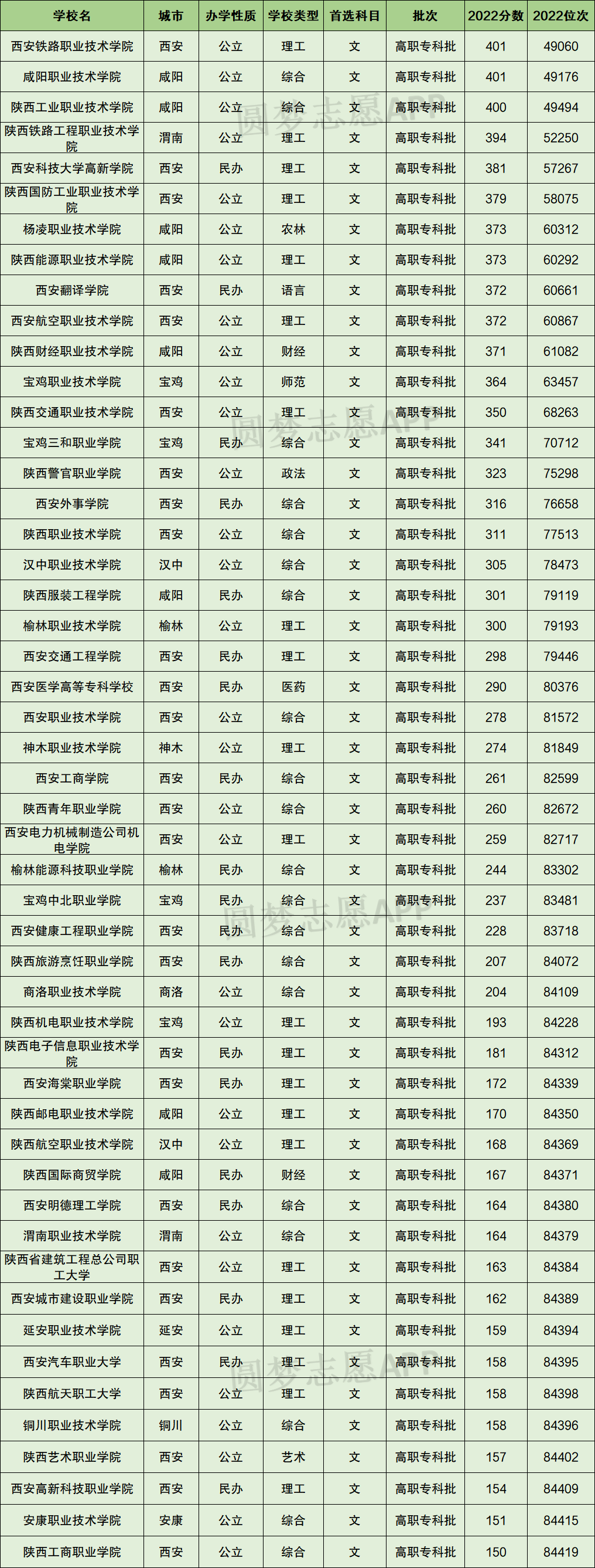 四、2022年陕西文科专科大学分数线及位次
