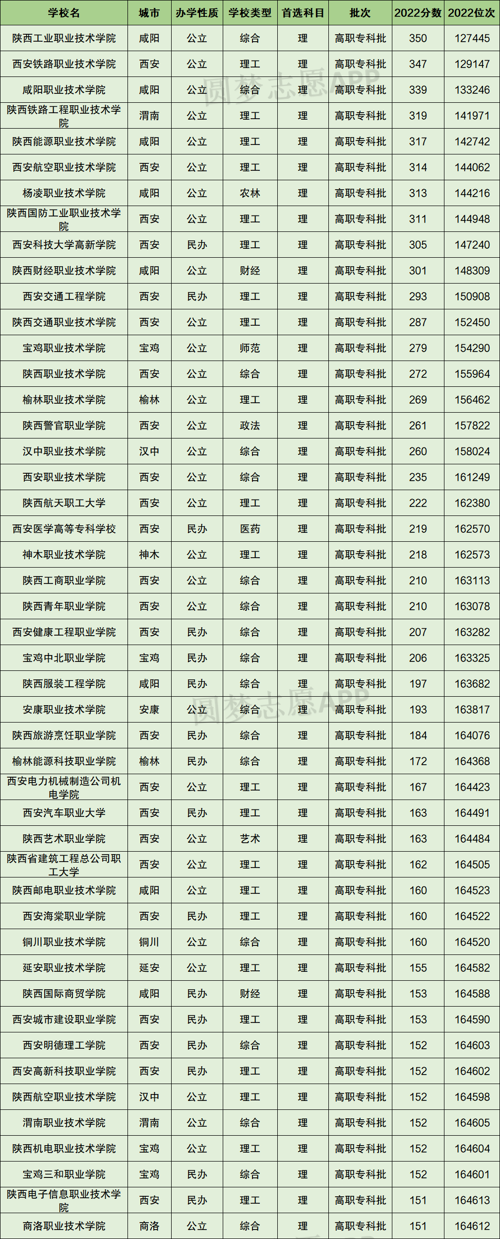 1、陕西省理科分数最高的专科大学为陕西工业职业技术学院,录取分数线为350分,录取位次为127445;其次为西安铁路职业技术学院,最低分数为347分,对应全省最低位次为129147。