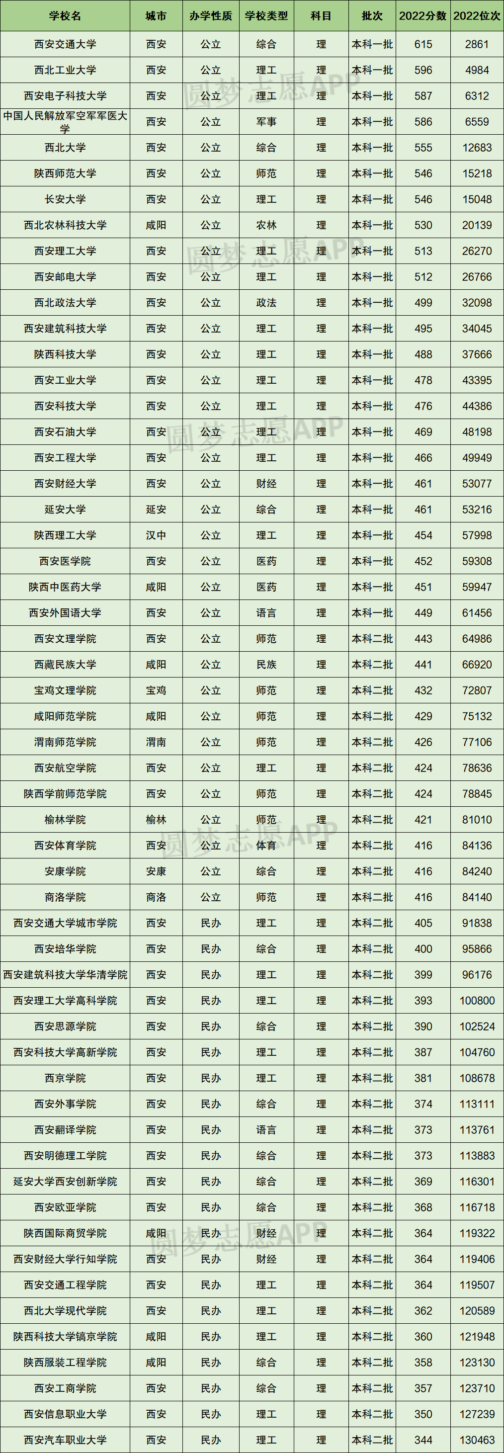 一、2022年陕西省理科本科大学分数线及位次