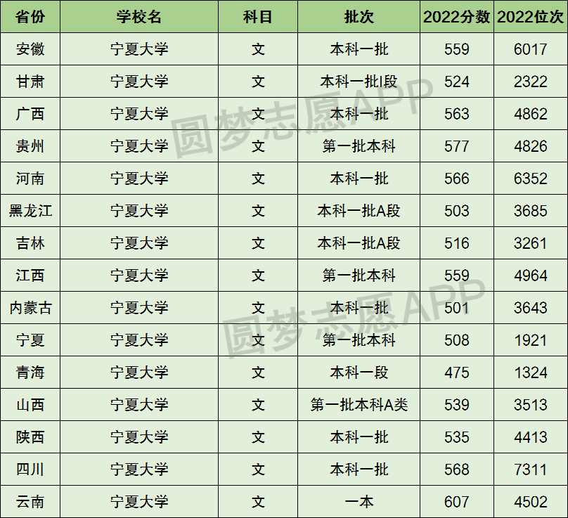 1、宁夏大学在全国普通高考省份的【文科】招录数据,包含招生批次等信息: