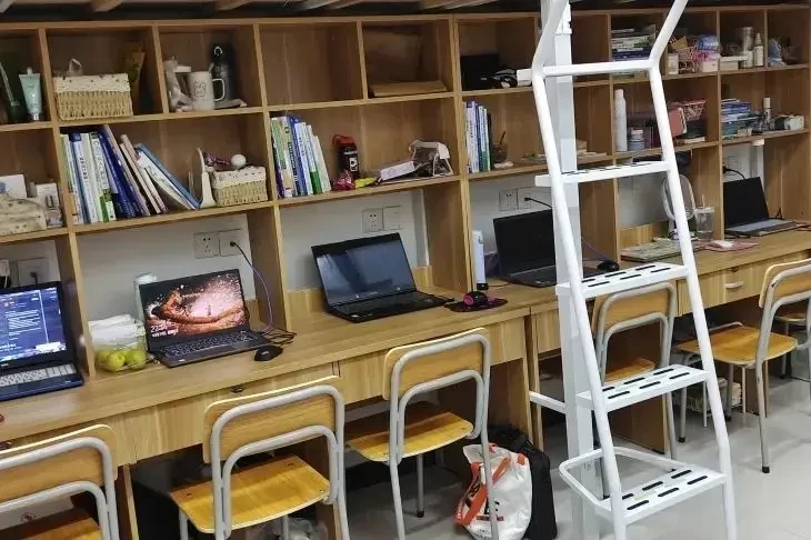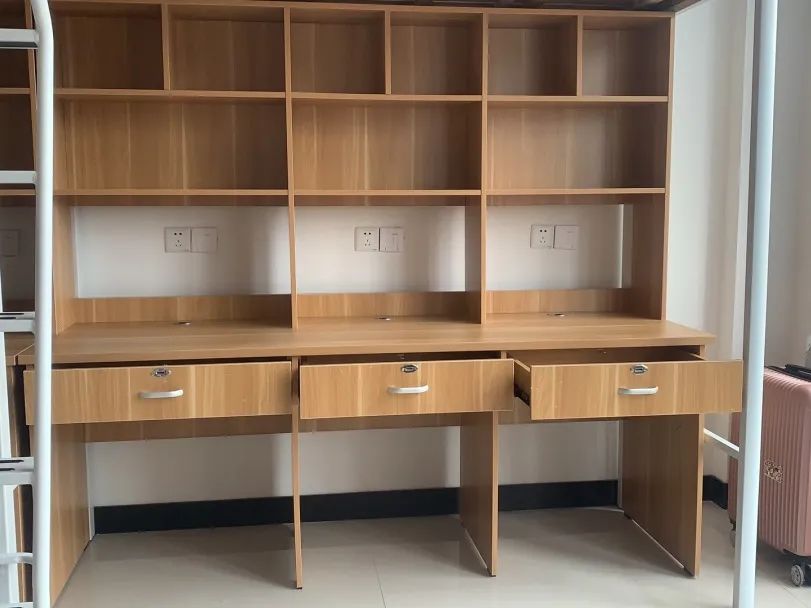 四人寝:床和桌子采用上床下桌的标准摆放,一条相对垂直的楼梯,楼梯最底部有偏离地面一段距离的架子,可用于摆放垃圾桶或者一双鞋。每人配有两个柜子,书柜和衣柜,高度都为床高,书柜的桌子以下是一个空的架子,可用于放鞋或者行李箱。