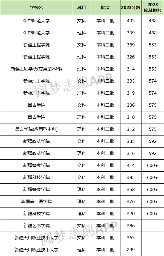 2023年全国排名第553,在新疆最低分为文科389分、理科314分,理科分数超过新疆二本线分数。