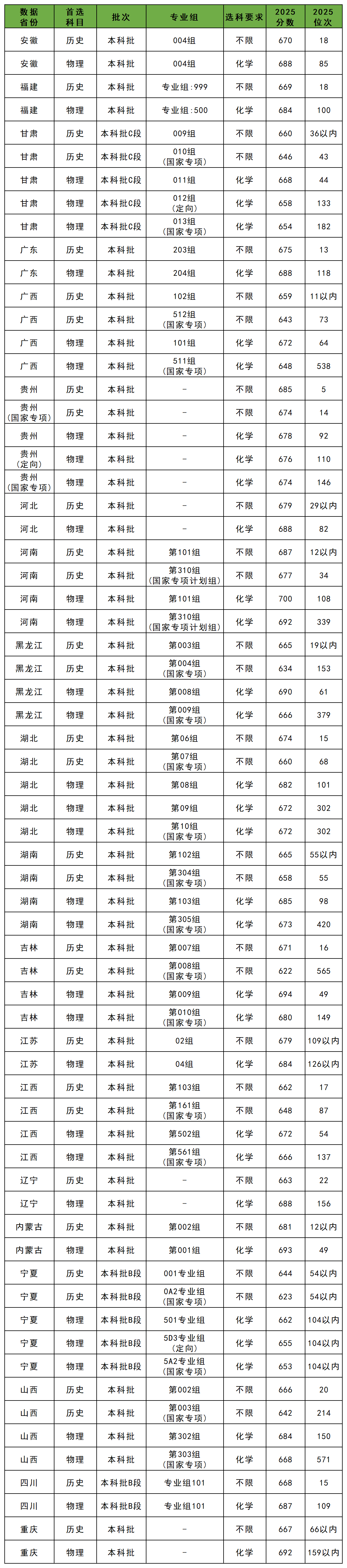 物理类录取最低分648分(广西、国家专项);历史类录取最低分622分(吉林、国家专项)。
