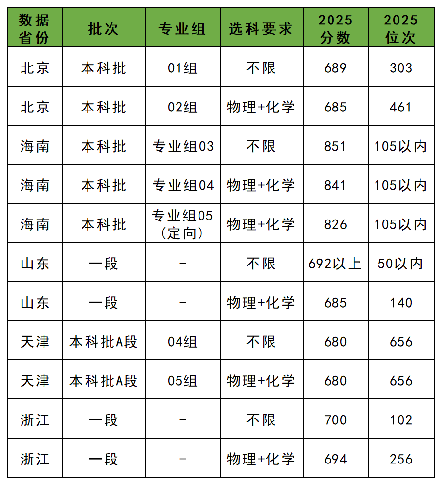 录取分数线最低是在天津:680分(04组、05组)。