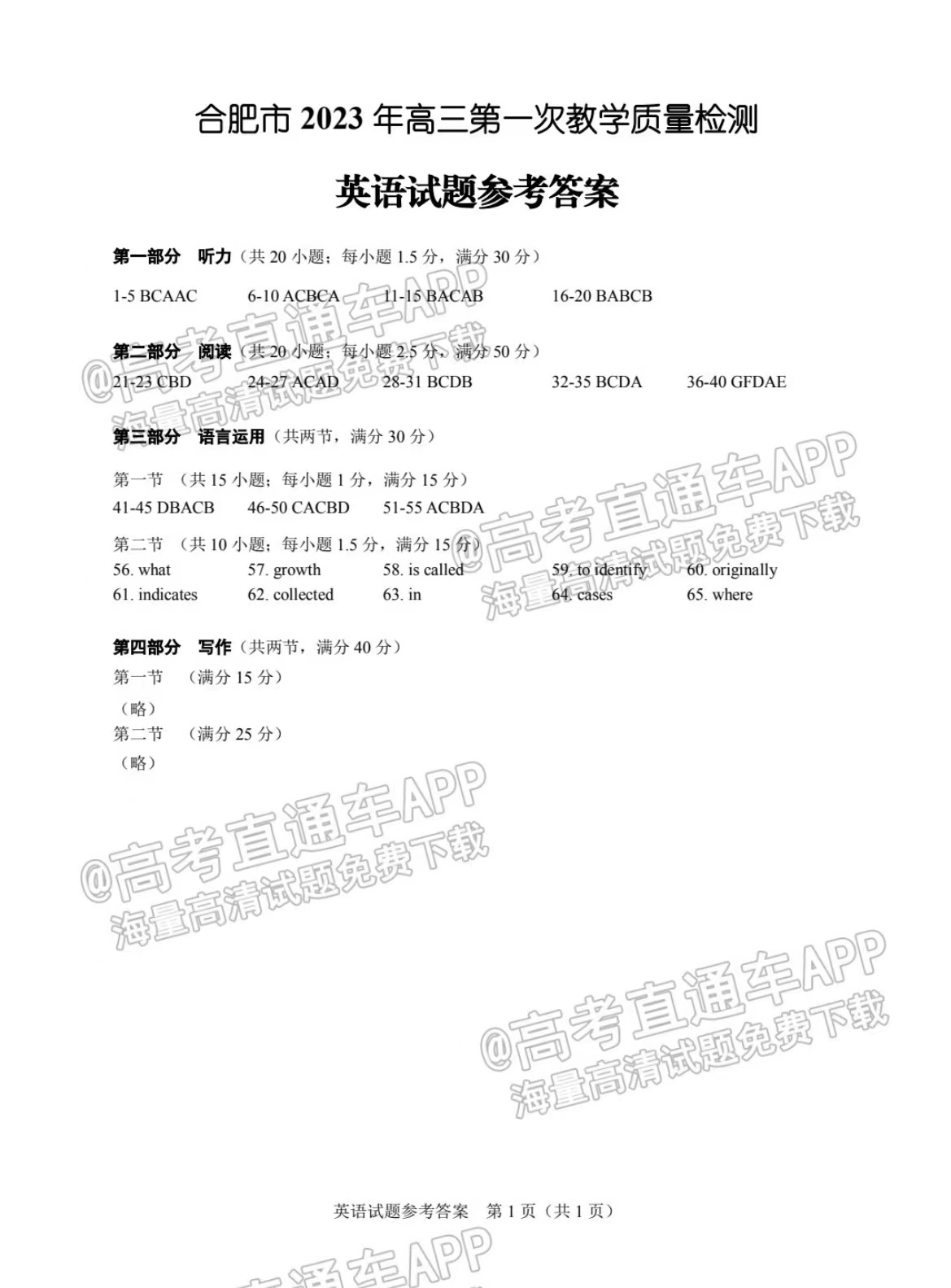 2023合肥一模是合肥市高三的第一次模拟考,对于合肥高三考生来说很重要。2023合肥一模将于2月11日开考。在合肥一模的各科考试结束后,高考100网将会整理合肥一模英语试卷及答案2023汇总,供参考。合肥一模2023俗称“小高考”,对于同学们后期的复习方向、自信心的建立有着重要的影响,祝同学们在此次考试中都能取得不错的成绩!