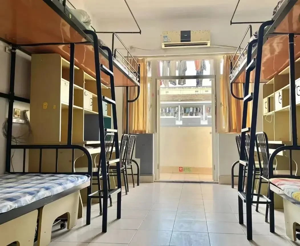 我校实行宿舍公寓化管理,标准六人间; 每间宿舍定时供应热水洗澡,有独立卫生间和独立阳台,每间宿舍有独立阳台,空调等配备齐全。卫生间有两个小隔间,早上不用担心抢厕所,每人都有自己的书桌、壁橱等。