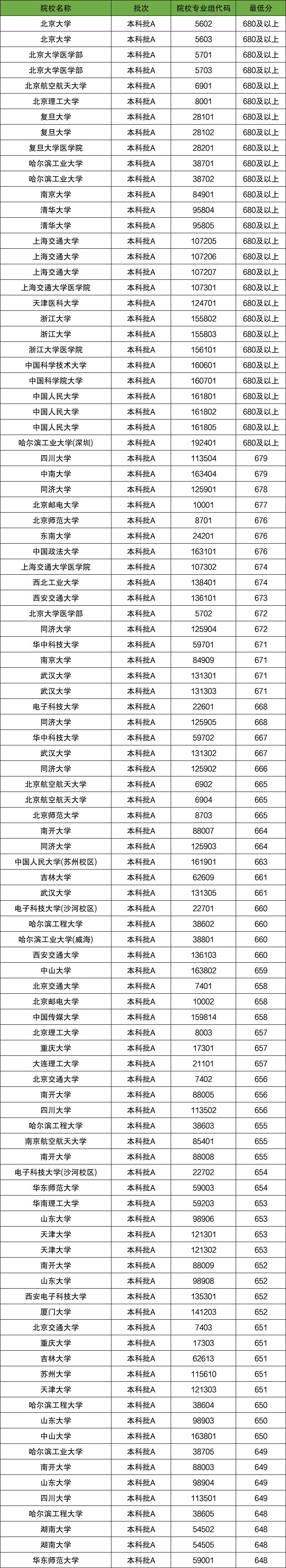 本科招生录取的大学中,录取分数线最高的是北京大学,2025年最低分是680分以上,对应全市位次是第656名。分数线排名靠前的还有北京航空航天大学、北京理工大学、复旦大学、哈尔滨工业大学、南京大学、清华大学等,均为680分以上。