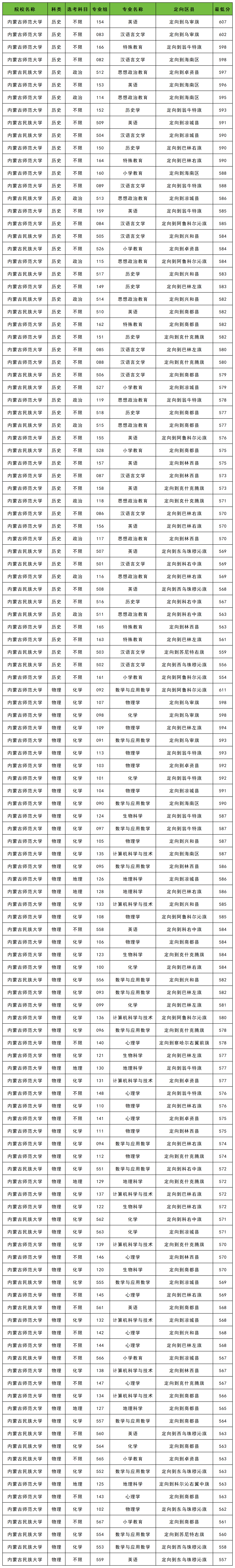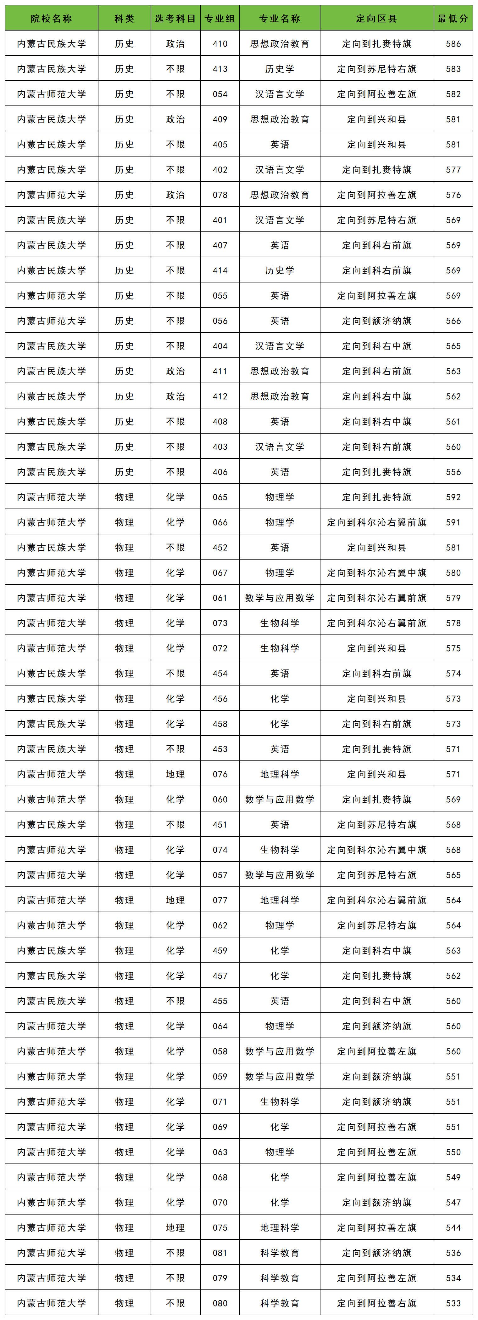 物理类最低分为557分,最低分专业为英语(定向到东乌珠穆沁旗);最高分专业为英语(定向到科右中旗),分数为584分。历史类最低分为556分,最低分专业为汉语言文学(定向到西乌珠穆沁旗);最高分专业为思想政治教育(定向到卓资县),分数为597分。