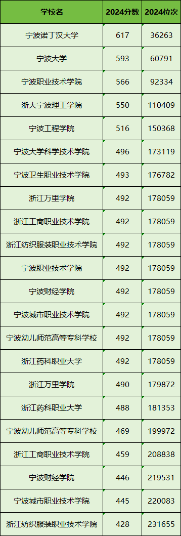 如下为各位整理了2024年宁波各大学考生的最低分数线一览表,供大家参考: