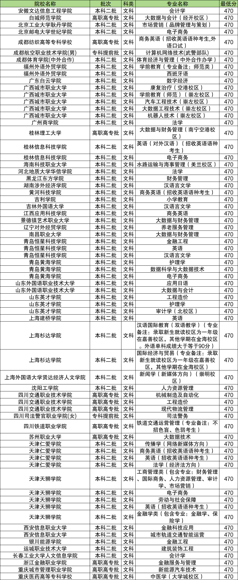 从全国大学四川省高考的分数来看,470分的文科考生能报考的专业,以及对应的学校如下表: