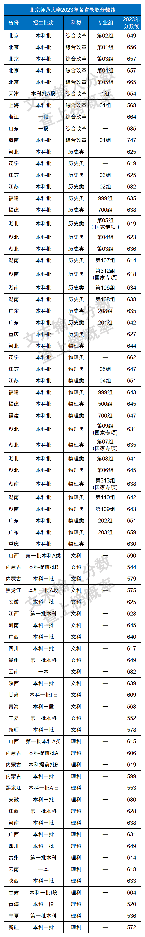 小编通过圆梦志愿查询数据可知,北师大2023年在各省的招生分数情况如下:(图片可滑动查看)