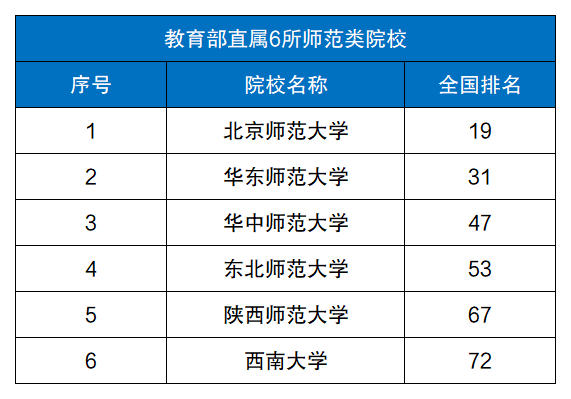 说起国内综合实力较为突出的师范类院校,教育部直属的6所大学必须榜上有名。在软科师范类大学排名中,这6所学校均在前七之列。