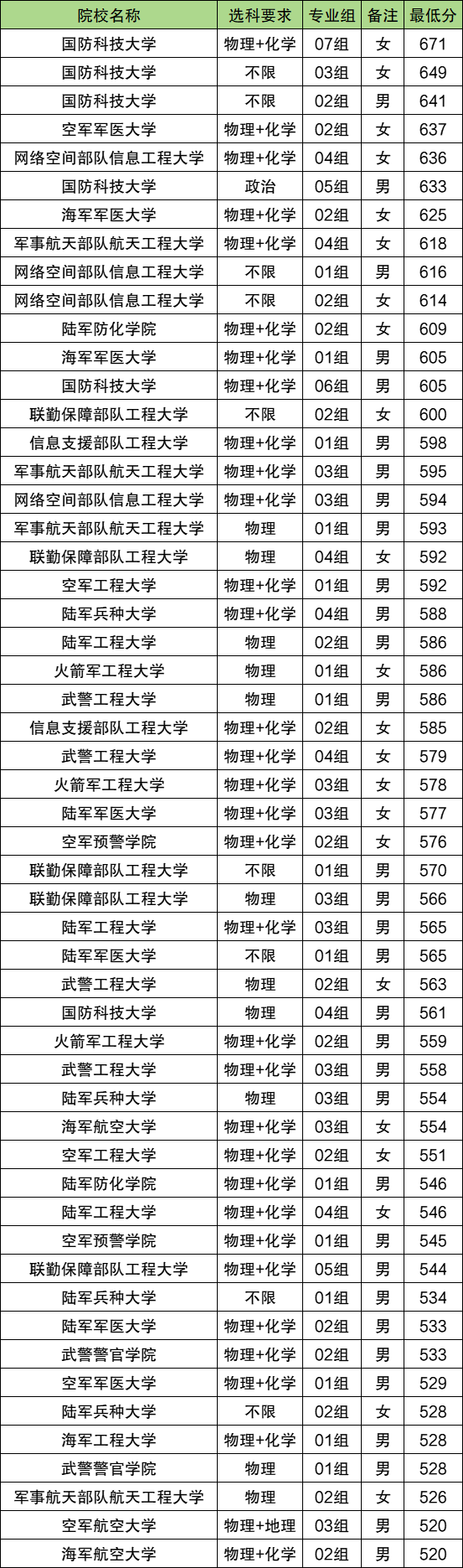 下面以北京为例,为大家整理2025年各个军校录取分数线男生、女生一览表。各专业组的选考科目要求不同,录取分数线自然也不相同,具体可参考下面的表格。