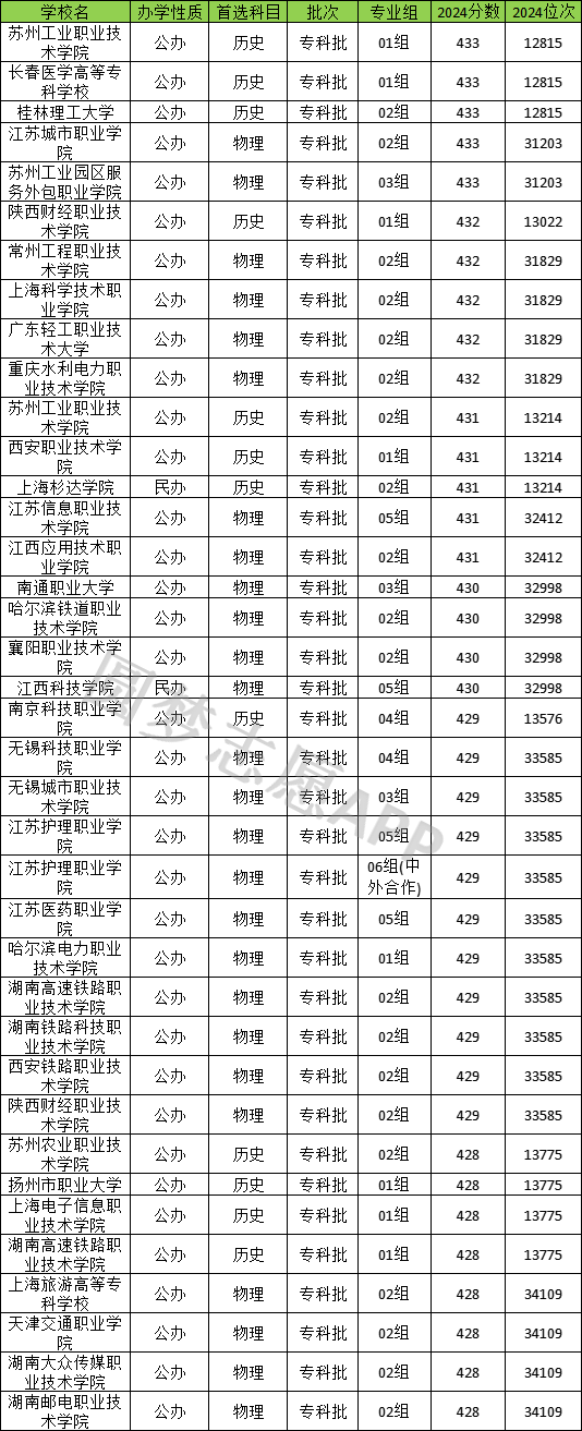 在江苏省430分左右(428分-433分之间)的可以上大学,专科历史类11所;其中公办院校10所,有桂林理工大学(433分)、苏州农业职业技术学院(428分)、上海电子信息职业技术学院(428分)等;民办院校1所,为上海杉达学院(431分)。