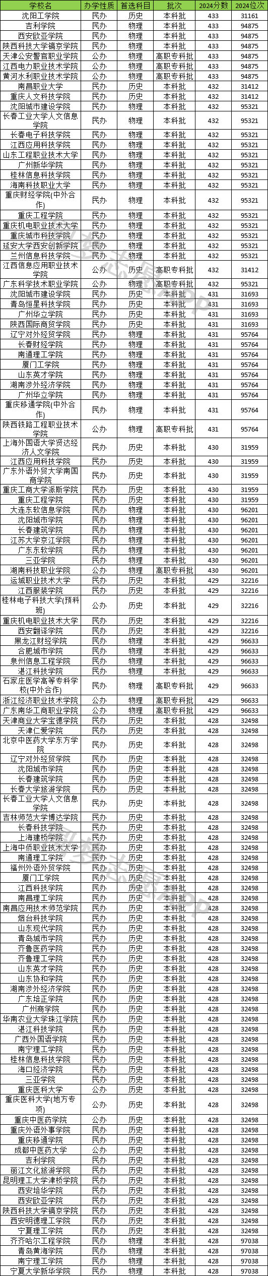 物理类430分左右(428分-433分之间)能上的大学有48所,有黄河水利职业技术学院(433分)、广东科学技术职业学院(432分)、陕西铁路工程职业技术学院(431分)等。