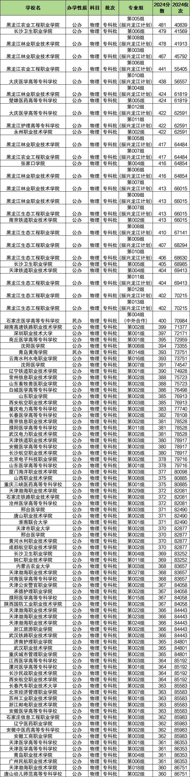 专科批大学中分数线最高的是黑龙江农业工程职业学院第005组(振兴龙江计划)481分,另外分数线较高的还有长沙卫生职业学院第006组(479分)、黑龙江林业职业技术学院第008组(振兴龙江计划)479分、黑龙江林业职业技术学院第003组(振兴龙江计划)467分。
