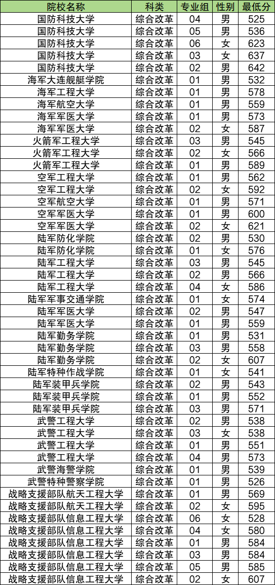 2024年在北京综合改革招生的军校录取分数线范围是525分到642分,收分最低的学校为国防科技大学04组,2024年男生最低分525分;收分最高的学校为国防科技大学02组,2024年女生最低分642分。