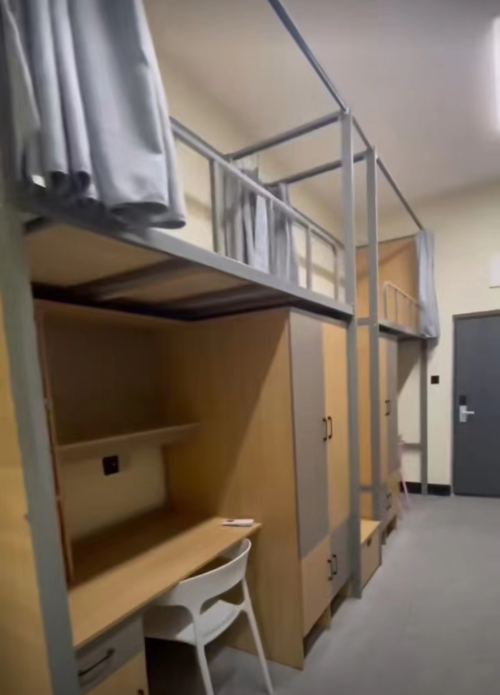 上床下桌、有床帘、有独立卫生间、有空调、有阳台、有饮水机(不同楼位置不同)、不断电,热水限时供应(夏季冬季各不相同)、每个人都有一个衣柜。