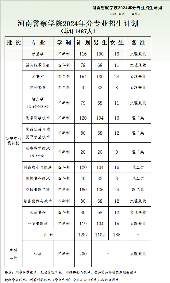 河南警察学院招生简章已公布,2024招生计划1287人,其中侦查学116人,招生专业包括侦查学、治安学、刑事科学技术、交通管理工程、网络安全与执法、警务指挥与战术、经济犯罪侦查、公安管理学等。