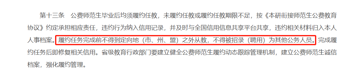 从最新的政策来看,除了本硕衔接培养这一变化外,违约后的处理也有很大的调整。以往违约只需要返还享受的公费教育费用,并缴纳违约金。但新政办法后,一旦违约,会被强行纳入征信。不能考公,也不能去定向地区以外的学校任教。六年的服务期一天没有履约完成,对从教和考公的限制就一天不会接触。所以对有打算报考六年制公费师范的同学来说,是否能完成履约是必须要考虑清楚的问题。