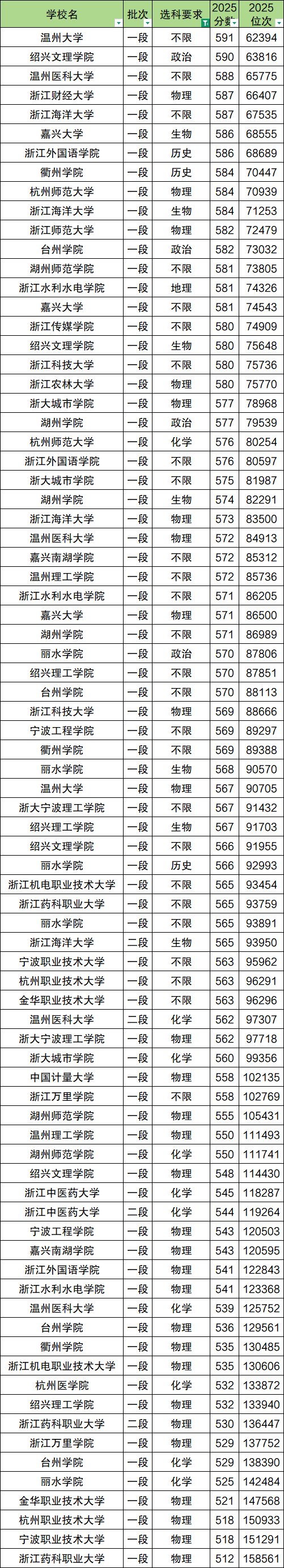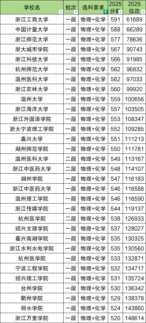 浙江实行新高考,本文“二本”参考的是录取分数线在特控线以下到一段线以上的所有本科大学。2025年批次线如下: