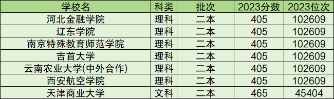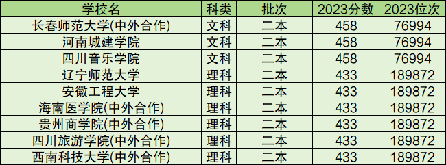 文科生刚过线能走的只有天津商业大学这一所,理科生刚过线能走的公立二本有吉首大学、南京特殊教育师范学院和辽东学院等。