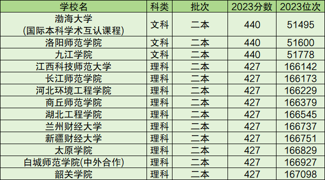 文科压线录取的公办二本有渤海大学(国际本科学术互认课程)、洛阳师范学院、九江学院。理科压线录取的公办二本大学有江西科技师范大学、河北环境工程学院、湖北工程学院、新疆财经大学等。