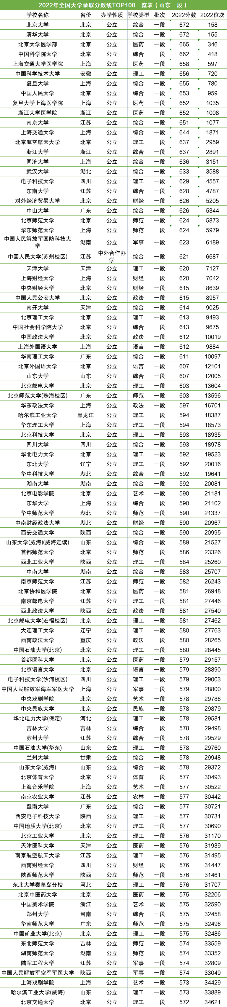 在山东一段中,分数线最高、最难考的十所大学是北京大学(672分)、清华大学(672分)、北京大学医学部(665分)、中国科学院大学(662分)、上海交通大学医学院(658分)、中国科学技术大学(656分)、复旦大学(655分)、中国人民大学(653分)