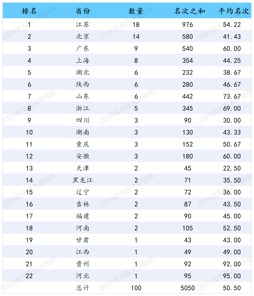 从各省市自治区进入2024中国大学综合实力前100名的大学数量排名来看,江苏进入前100的大学最多,共有18所院校,数量排名第一名;
